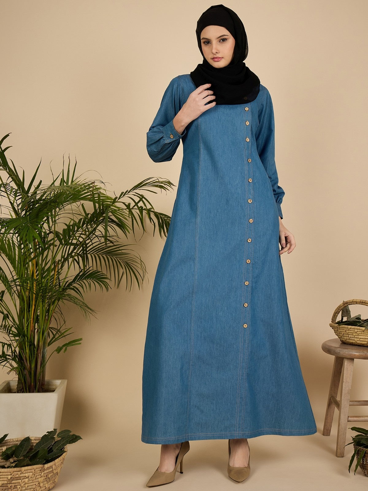 This elegant blue denim abaya is designed in a solid color with a stylish front side button pattern for a modern yet modest look. Made from soft denim fabric, it offers all-day comfort and durability. Perfect for casual outings or daily wear, this abaya combines simplicity with a touch of elegance.