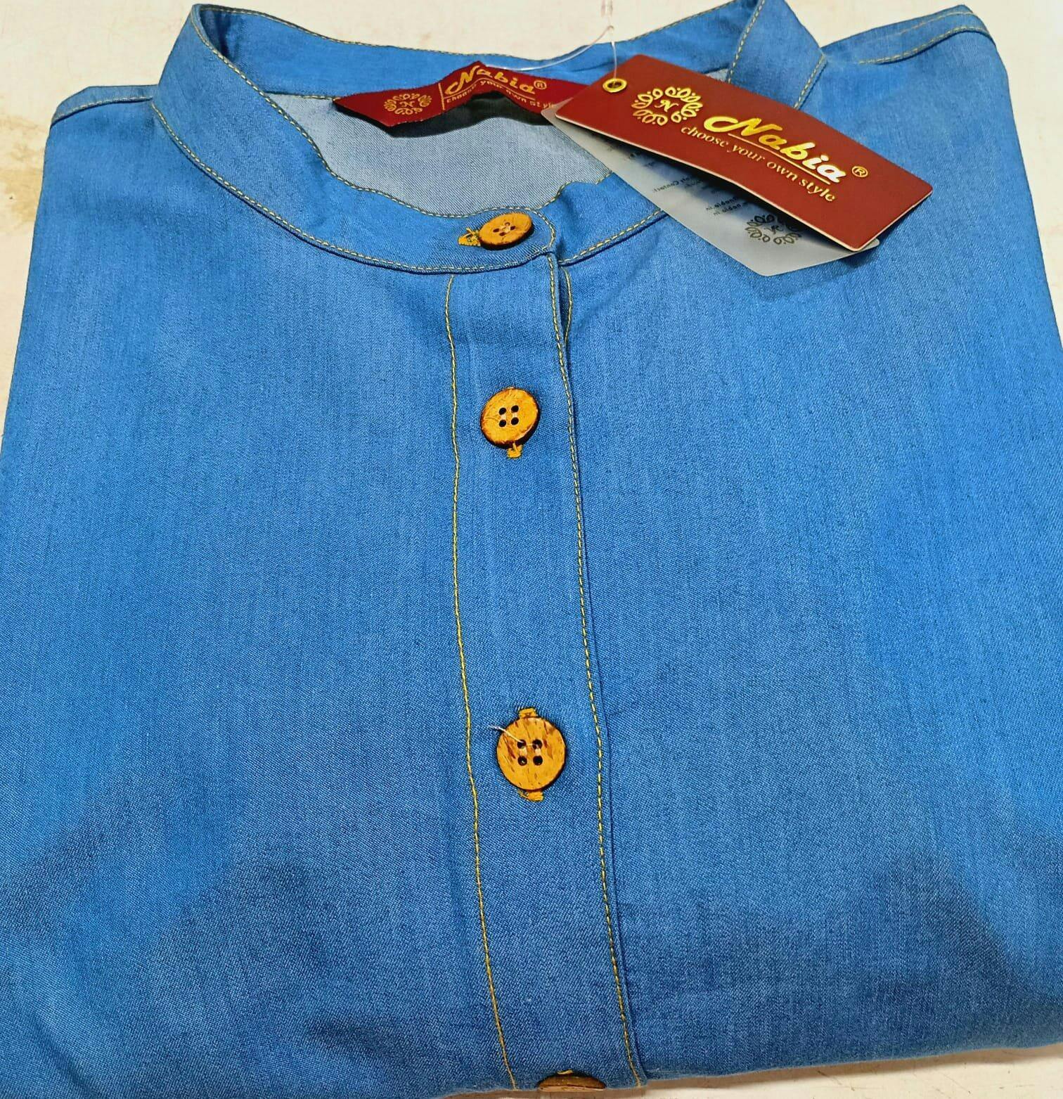 Introducing Nabia's modern long maxi denim Abaya, a timeless wardrobe addition for Islamic and Muslim women. This dress features a sophisticated mandarin collar, two patch pockets, and long roll-tab sleeves, with a functional 6 buttons open. Elevate your style with this effortlessly chic and comfortable Abaya.