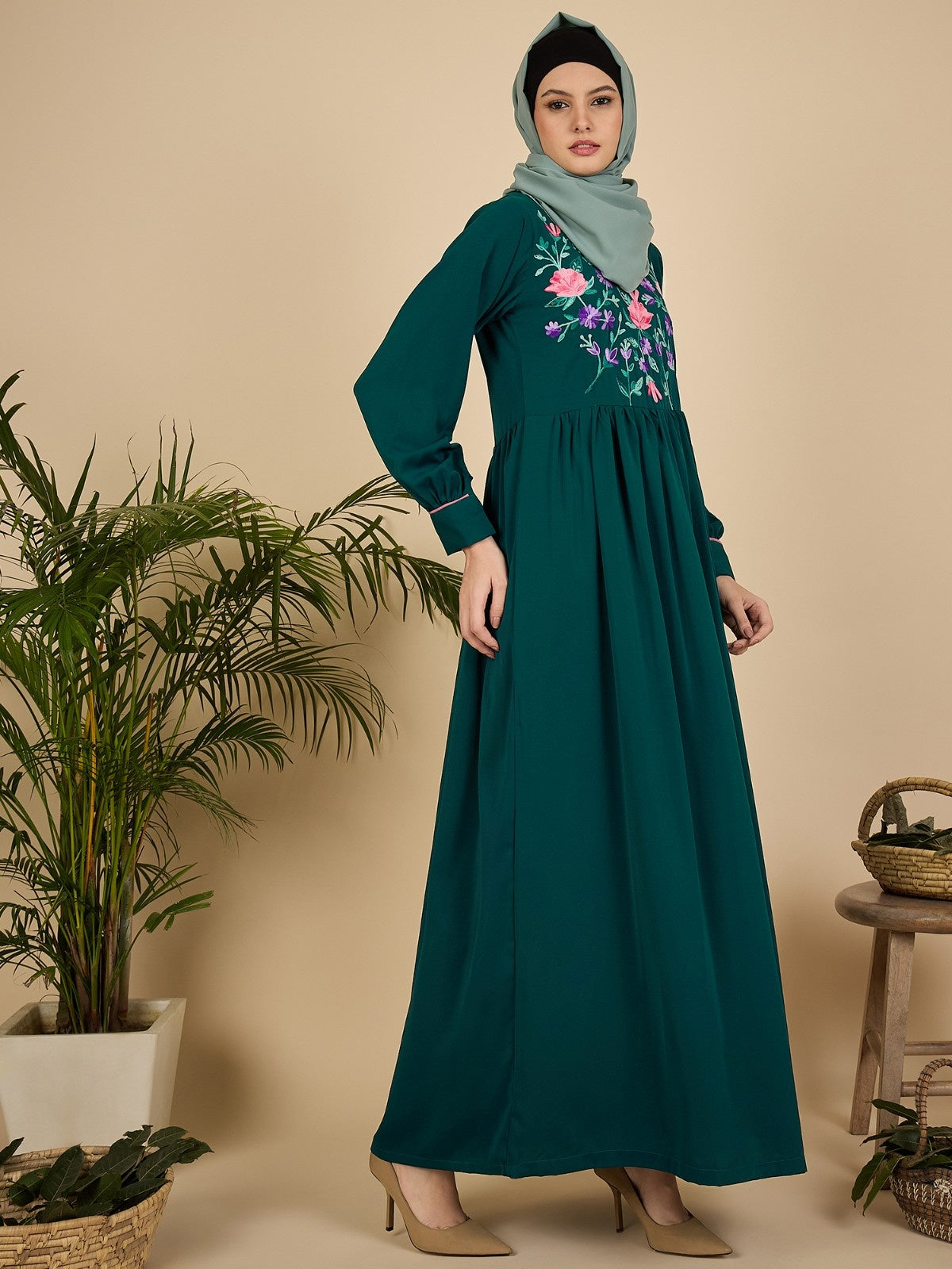 This modest bottle green embroidered abaya is designed for Muslim and Islamic women, offering elegance with full coverage. Made from premium nida matte fabric, it feels soft, lightweight, and flowy. The abaya features delicate floral embroidery on the chest, long sleeves with cuffs, and a relaxed A-line silhouette for everyday comfort and style.