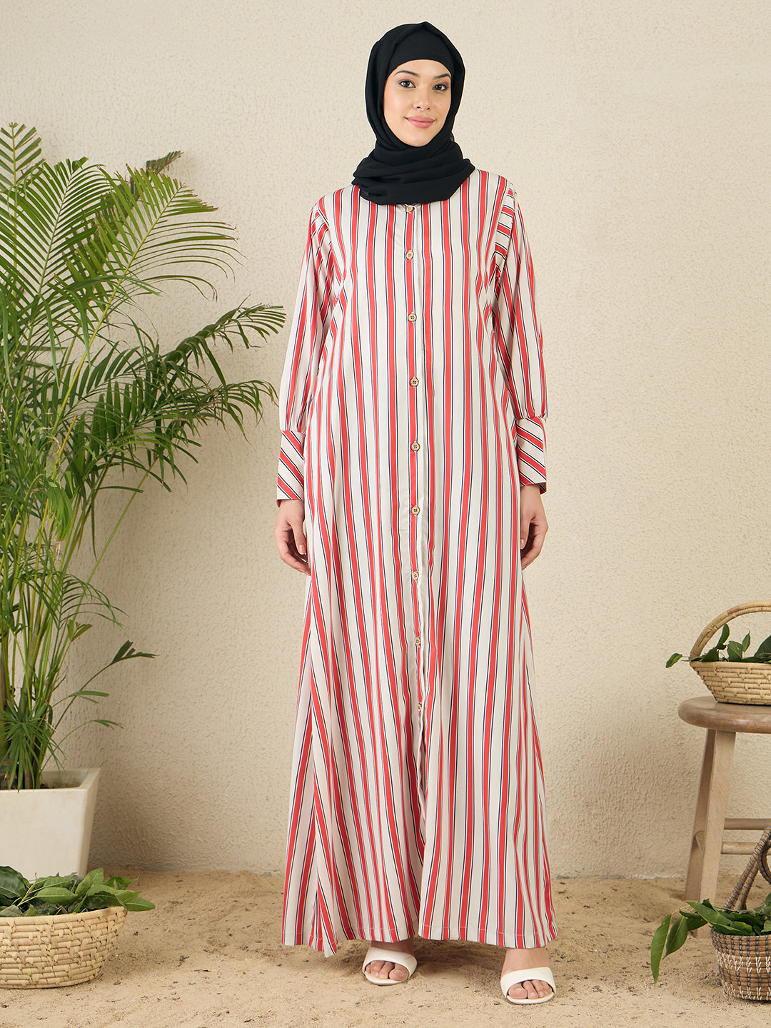 This red and white printed abaya, a favorite among fashion enthusiasts, lets you make a bold statement. Ideal for daily wear, it features a front-open design with convenient side pockets. Perfect for Muslim women, this versatile abaya is a timeless addition to your wardrobe, combining style and practicality for any occasion.