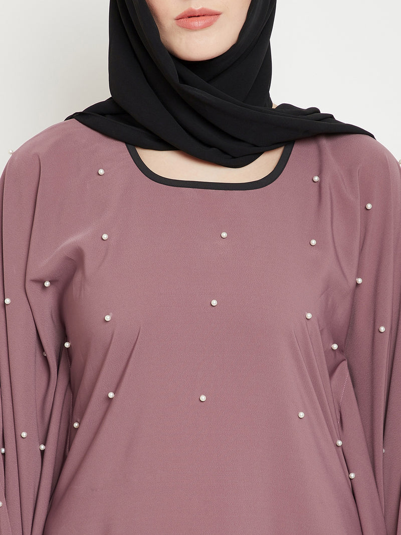 Nabia presents a loose-fit maxi puce pink kaftan abaya adorned with pearl design, crafted from solid Nida Matte fabric. This attire is exceptionally soft, breathable, lightweight, and easy to maintain. Fashioned for Islamic and Muslim women, it combines comfort with elegance, offering a stylish and practical choice for various occasions.