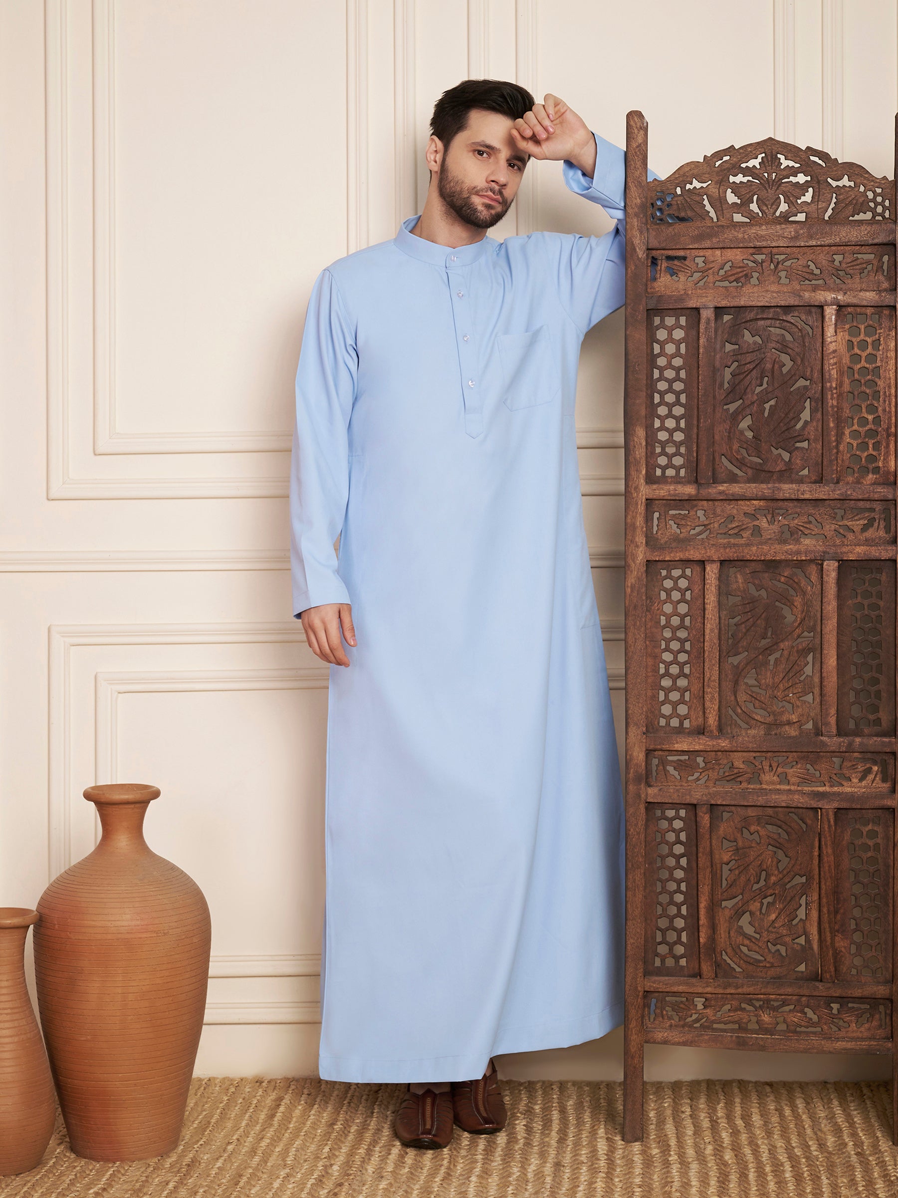 Elevate your traditional wardrobe with this men’s light sky blue thobe / jubba, crafted from premium poly cotton fabric for a perfect balance of softness, breathability, and durability. Designed with a classic mandarin collar, full-length sleeves, and a relaxed straight fit, it ensures all-day comfort. Featuring a buttoned placket and a minimal elegant design, this Islamic men’s thobe is ideal for daily wear, prayers, Ramadan, Eid, religious occasions, and formal gatherings, offering timeless style with modern comfort.