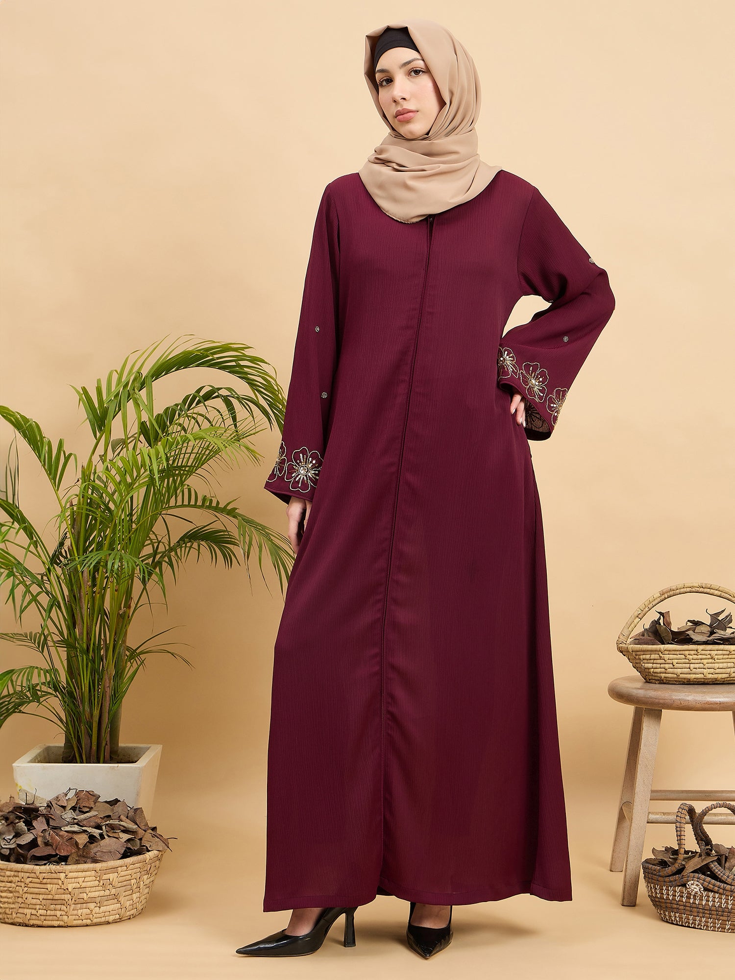 Elevate your modest wardrobe with this luxury maroon abaya burqa for women, crafted from premium Zoom fabric that offers a soft texture and an elegant, graceful drape. Designed for modern modest fashion, this beautifully hand-worked abaya features delicate embroidery that enhances its refined and sophisticated appeal. The stylish V-neck design provides a comfortable yet flattering fit, making it perfect for party wear, office wear, prayers, festive occasions, Ramadan, and Eid. A timeless blend of luxury, comfort, and classic Islamic modest wear for women.