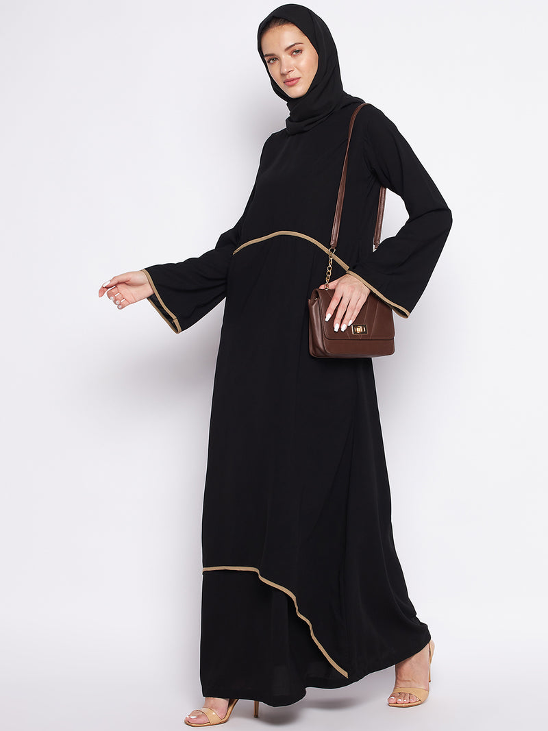 Introducing a black abaya with a double-layer design and chic beige piping, tailored for Islamic and Muslim women. Featuring free sleeves and a classic round neck, this solid abaya exudes elegance and versatility, making it an ideal choice for those who prioritize modesty and style in their wardrobe.