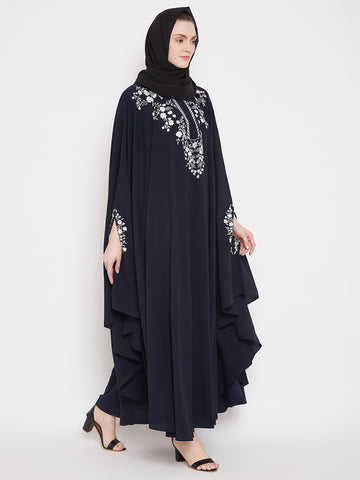 Indulge in the luxurious charm of Nabia's loose-fit maxi blue Irani kaftan abaya, featuring intricate chikan hand embroidery on solid Nida Matte fabric. Tailored for Islamic and Muslim women, this fashionable ensemble effortlessly combines traditional craftsmanship with contemporary fashion, offering a stylish and comfortable choice for various occasions.