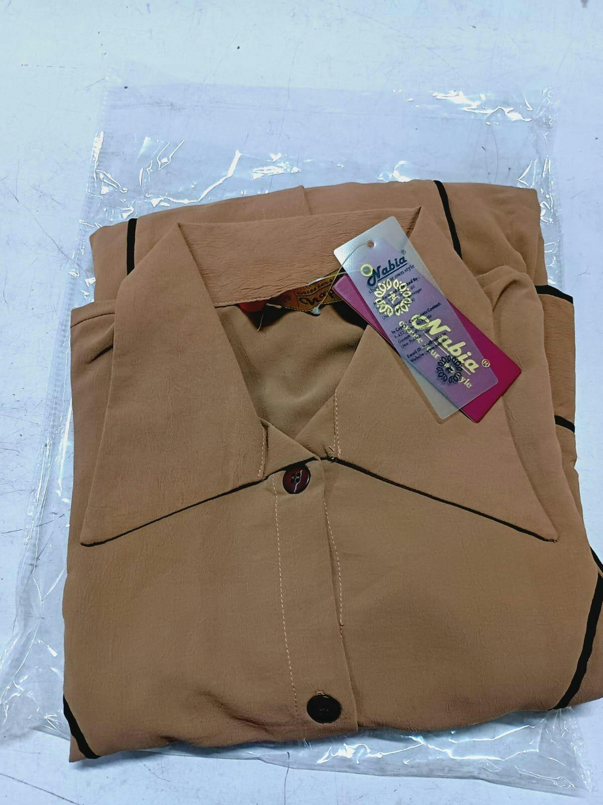 The Nabia rust coat-style front-open abaya burqa is a statement of modern modesty for Islamic and Muslim women. Crafted from luxurious Cy Crush fabric, it features elegant brown piping detailing for a polished touch. Part of the latest collection, this abaya combines comfort and style, offering an attractive look perfect for daily wear or special occasions. Embrace effortless elegance today!