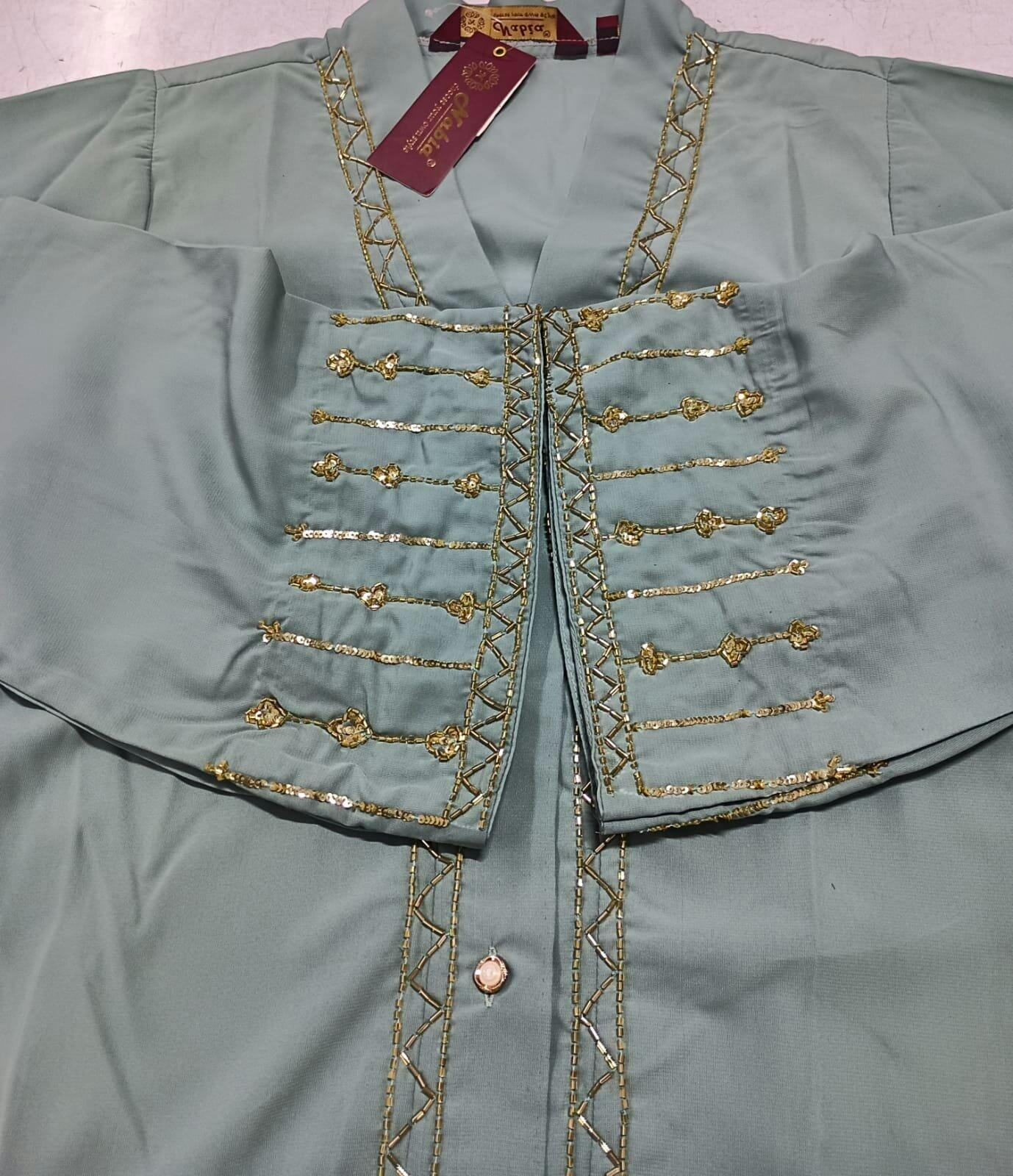This sea green solid luxury abaya burqa exudes elegance and modesty, adorned with intricate handwork detailing for a refined touch. Designed with a relaxed fit, it features a front-open style and button closure for effortless wear. Perfect for special occasions or everyday outings, this abaya blends tradition with contemporary fashion, offering a timeless and sophisticated choice for modern modest fashion.