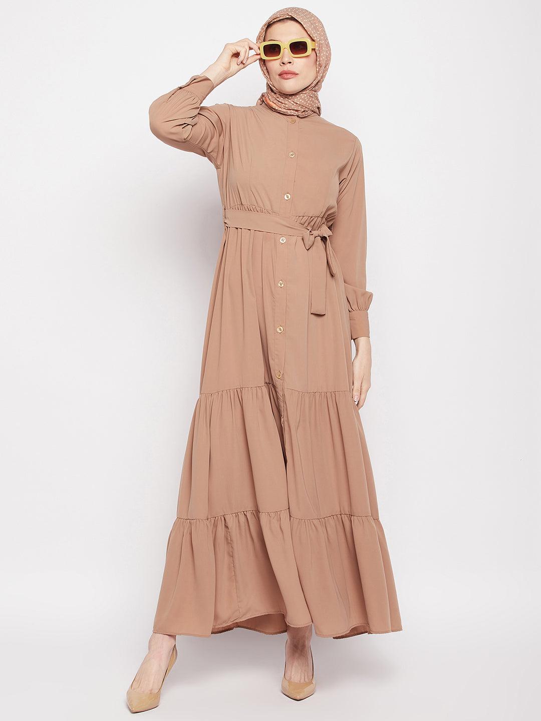 Enhance your look with this beige solid abaya. Featuring three frilled, bottons closure, a mandarin collar, and cuffed sleeves, it radiates sophistication. The included waist belt adds a fashionable flair for various occasions. This soft, versatile abaya is ideal for women embracing Islamic and Muslim fashion.