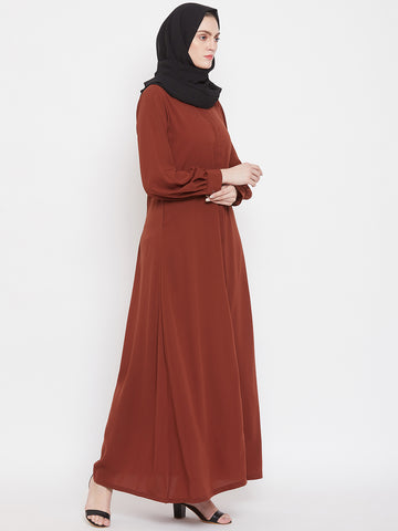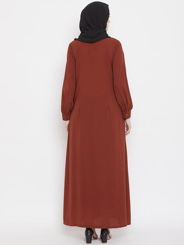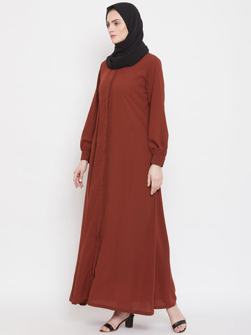 Nabia introduces a rust front-open abaya, featuring a mandarin collar, cuffed sleeves, and button closure. Designed for modern Muslim women, it ensures comfort and breathability. With convenient side pockets, this fashion-forward choice complements various occasions, embodying the essence of Islamic style and elegance.