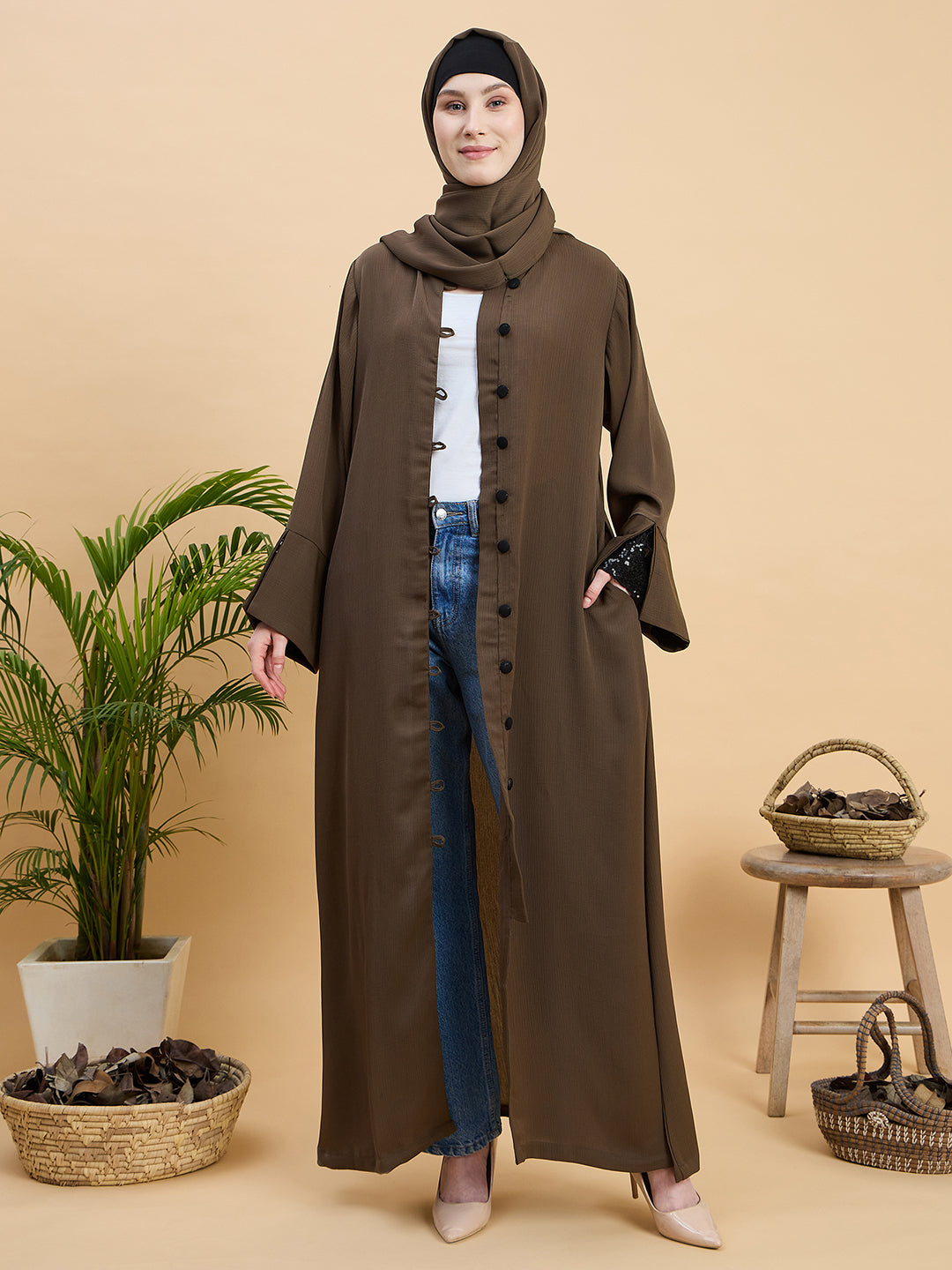 Enhance your modest wardrobe with this oat (khaki) color abaya, crafted from premium Zoom fabric for a smooth texture and graceful fall. Designed with a front open button closure, full-length sleeves, and a relaxed modest fit, it ensures all-day comfort and coverage. The plain solid design makes it ideal for daily wear, office wear, travel, prayer, Ramadan, Eid, and Islamic occasions. This women’s khaki Zoom fabric abaya blends timeless elegance with modern modest fashion.