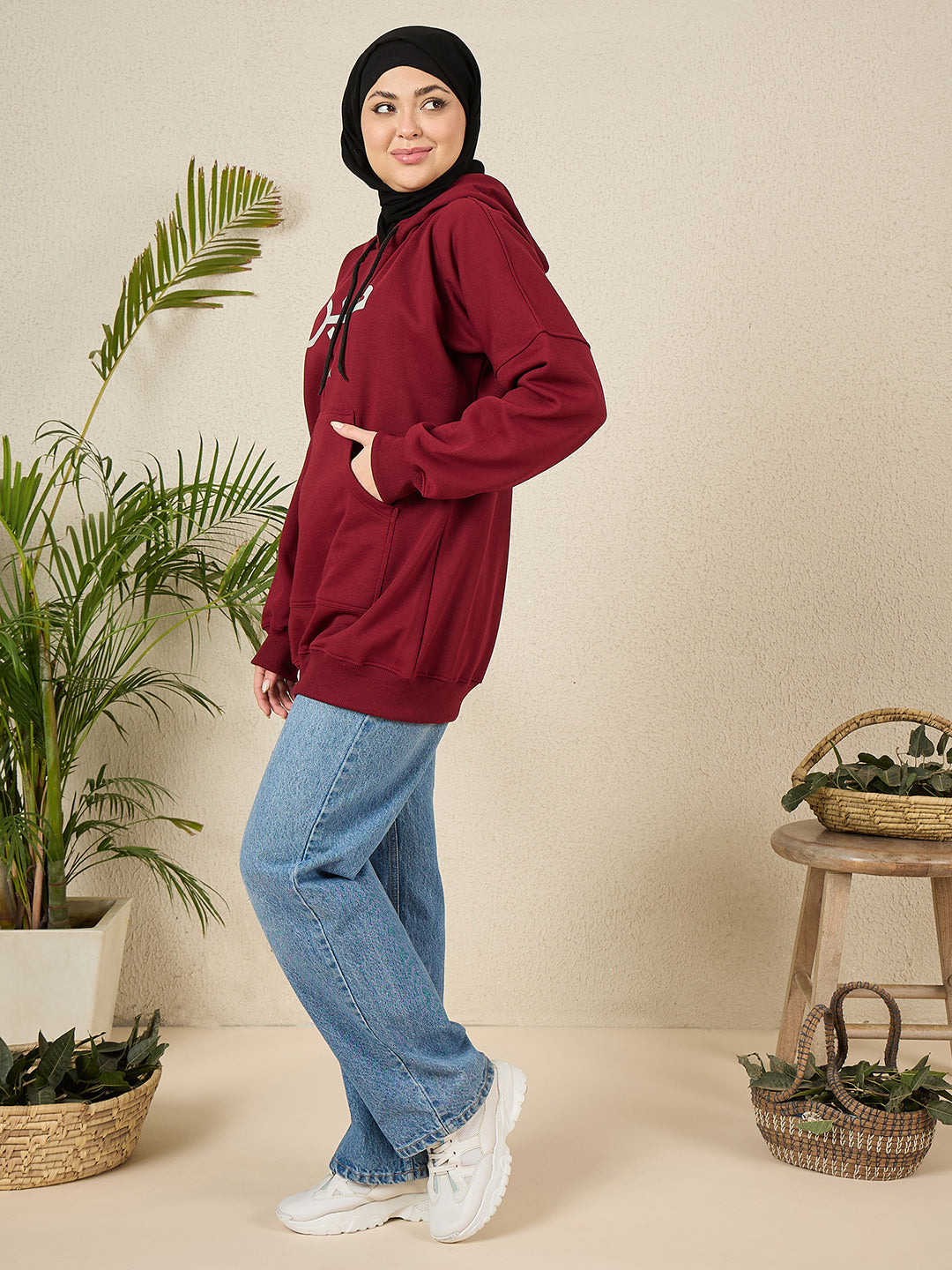 Elevate your winter modest wear with this Maroon Solid Fleece Hoodie for Women, specially designed for warmth, comfort, and full coverage. Crafted from premium soft fleece fabric. Featuring a slip-on closure, protective hood, roomy front pockets, and relaxed long sleeves, this full-length fleece hoodie is perfect for layering in winter, ensuring both comfort and modesty. Its contemporary longline design makes it ideal for casual outings, travel, office, college, and everyday winter wear.